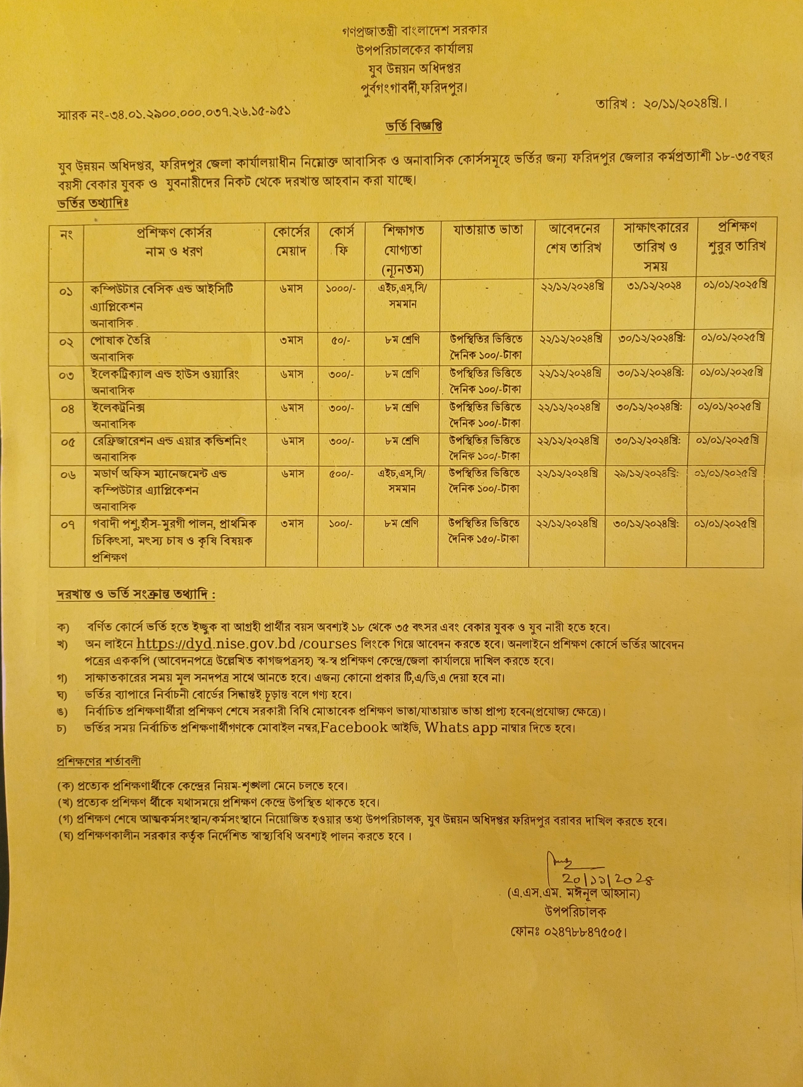 | | ৬ মাস মেয়াদী রেফ্রিজারেশন এন্ড এয়ারকন্ডিশন প্রশিক্ষণ কোর্স | উপজেলা কার্যালয়ে আবেদনপত্র জমা দেওয়ার পর মহা-পরিচালকের কার্যালয়/উপ-পরিচালকের কার্যালয় হইতে নির্দেশিত তারিখের মধ্যে প্রশিক্ষণের জন্য পাঠানো হয়। | বয়স (১৮-৩৫) বৎসরের মধ্যে নূন্যতম এস.এস.সি বেকার যুবক ও যুব মহিলা প্রশিক্ষণে আগ্রহী প্রার্থীগণ উপজেলা কার্যালয়ে আবেদন করবেন উপজেলা কার্যালয় আবেদন পত্রগুলি যাচাই বাছাই করে জেলা কার্যালয়ে প্রেরণ করবেন। অতঃপর জেলা কার্যালয় কর্তৃক নির্ধারিত তারিখে আবেদনকারীগণের স্বাক্ষাৎকার নিবেন। স্বাক্ষাৎকারের মাধ্যমে যারা চূড়ান্তভাবে নির্বাচিত হবেন তারাই প্রশিক্ষণে ভর্তি হতে পারবেন। |